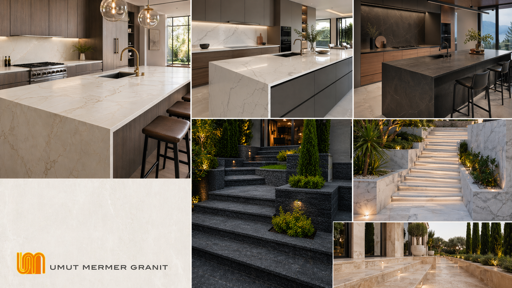 Umut Mermer Granit; porselen, Çimstone, Dekton, mermer, traverten ve bazalt uygulamalarında estetik, dayanıklı ve uzun ömürlü çözümler sunar. Mutfak tezgahlarından merdiven, zemin ve dış cephe uygulamalarına kadar her alanda kaliteli işçilikle hizmet verir.